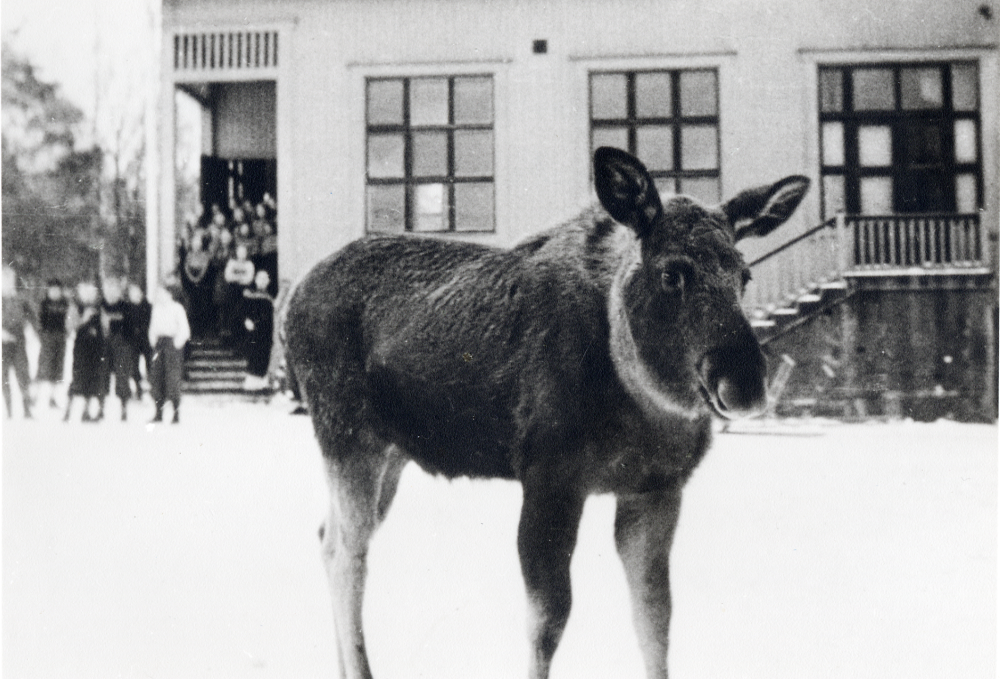 En älgkalv har förirrat sig in på skolgården vid Vita skolan i Hjälmsta