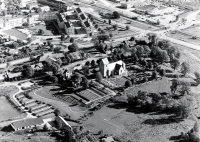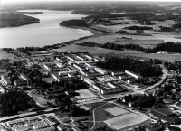 Flygfoto över Vallentuna kyrka och centrum