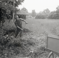 Rune Ländin slår gräs i trädgården vid Vada prästgård
