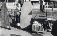 Lärarinnan Berna Nilsson med elever på examensdagen utanför Röda skolan