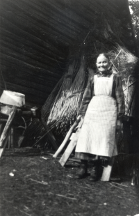 Selma Andersdotter i Fågelsången vid uthuset med vassknippen