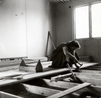 Ulla Gustafson spikar lamellgolvet i huset på Norrängsvägen 5 i Ormsta