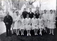 Prästen Röberg med konfirmander utanför Frösunda kyrka
