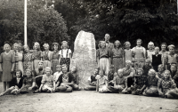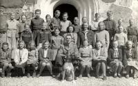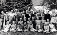 Läraren Gösta Sahlin med skolbarnen i Össeby-Garns kyrkskola