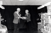 Bokfest 17 november 2001. Vallentuna biblioteks vänner överlämnar årets bokgåva