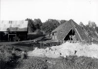 Ormstavägen med Ormsta gårds lada och ladugård strax före rivningen