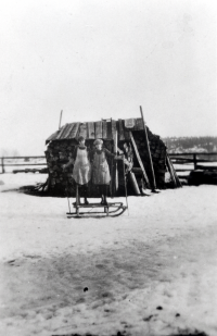 Karin och Alice Helgöstam på en kälke vid Helgö gårds vedbacke