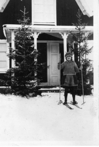 Maj Linder på skidor utanför Påtåker i Vallentuna