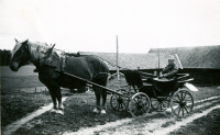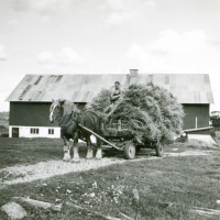 Edvin Jansson med häst och vagn vid Mellangården i Orkesta Lundby