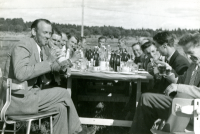 Läraren Gösta Sahlin med skolbarnen vid Össeby-Garns kyrka
