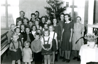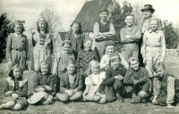 Lärarinnan Ingrid Lindell med barnen utanför Össeby-Garns kyrkskola