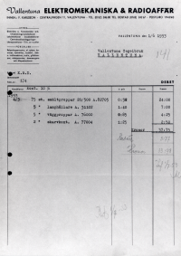 Räkning från Vallentuna elektromekaniska & radioaffär