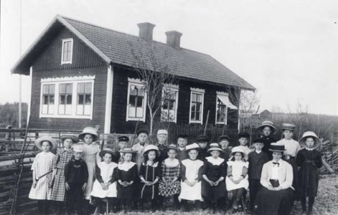 Lärarinnan Ida Högberg tillsammans med skolbarnen utanför Halls skola. Fotograf: Okänd ca 1900.