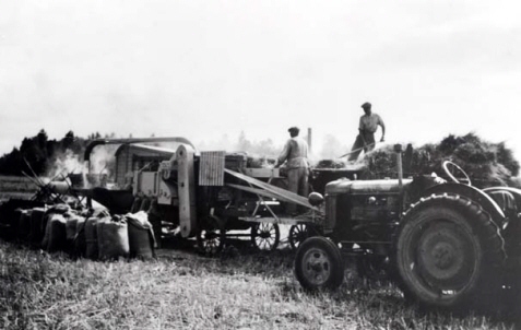 Första skördetröskan på Tjusta gård i Kårsta. Med ryggen åt kameran står Vilhelm Malmberg och t h Seth Helgöstam. Fotograf: Erik Ask 1947.