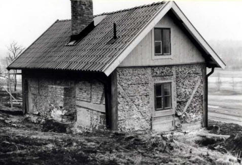 Torpet Hasselkrogen i västra Vallentuna återuppfördes 1899 efter en brand samma år och är ett exempel på ett spisvedshus eller kubbhus. Fotograferat i samband med en reparation på 1980-talet. Fotograf: Bertill Johansson ca 1985.